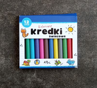 Kredki świecowe - 12 intensywnych kolorów. Nie wymagają temperowania.