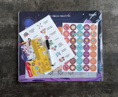 Magnetyczna tablica motywacyjna o wymiarach 35 cm x 30 cm. Może służyć do nauki obowiązków, kontroli postępów i motywowania dziecka.